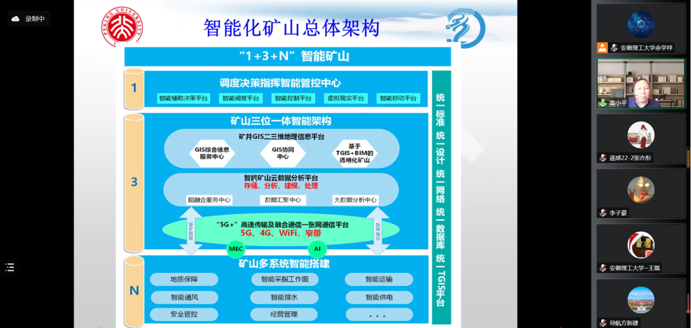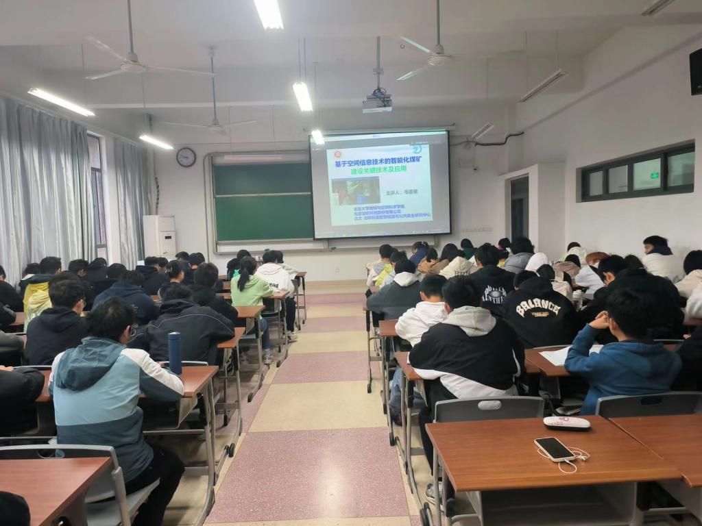 报告会上,毛善君教授强调了空间信息技术对煤矿智能化建设的重要性,介绍了智能化煤矿建设的基本要求与工程要求,详细阐述了地测保障系统、井下精确定位系统、“一张图”管控平台、智能化采掘、智能化通风和大数据分析等关键技术及应用情况;围绕 “高科技煤炭”的建设目标——无氧开采,展望了未来煤炭开采可以像航空航天、高铁一样成为高科技象征的美好前景。最后,毛善君教授鼓励同学们认真学习专业知识、掌握专业实践技能、提高编程能力,为智能化煤矿建设贡献自己的一份力量。